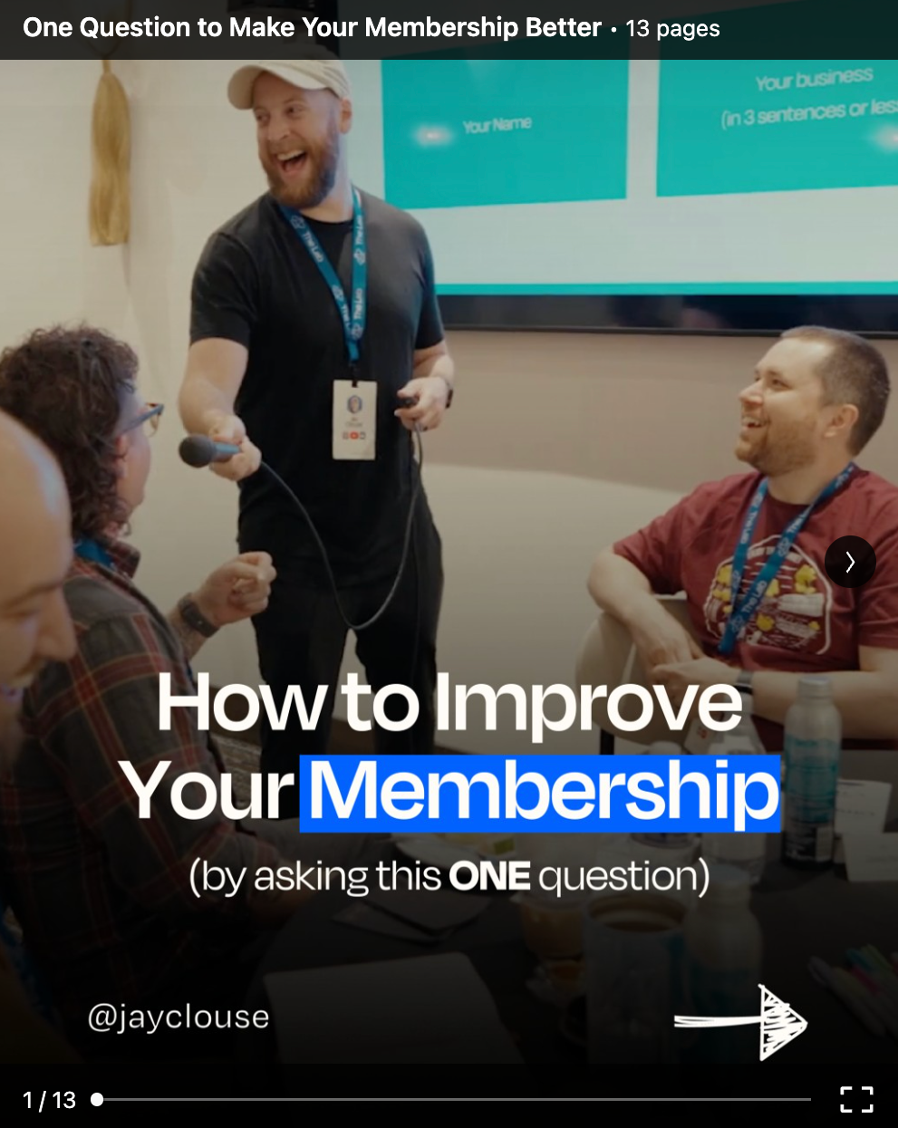 A LinkedIn carousel is a single post that contains multiple slides that users can click or swipe through. You see carousel posts on other social media platforms like Instagram, too. Unlike Instagram, however, LinkedIn carousels are typically uploaded as documents (PDFs) rather than images.